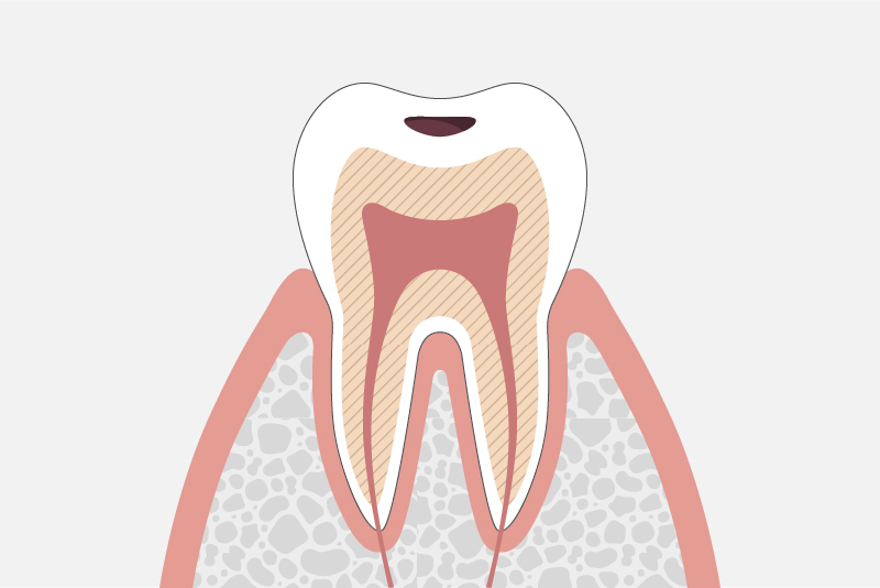 象牙質の内側の歯髄にまで虫歯が達したものです。この段階では、歯髄に細菌が進入し激しい痛みを伴うことがあります。歯髄の炎症が重度な場合は、歯髄組織を除去したあとで、根管内を消毒し、シーリング材を用いて充填します。